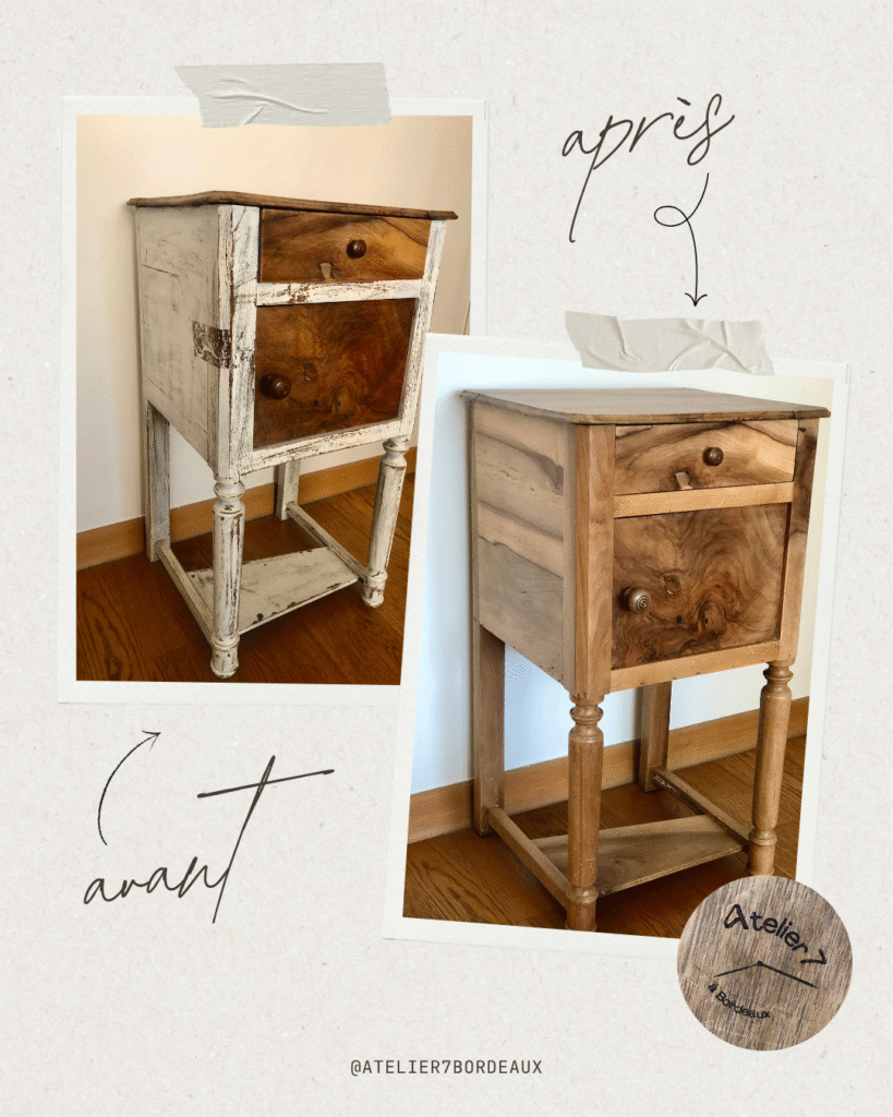 Sous les couches de peinture, j’ai découvert un bois magnifique, un veinage vivant, des imperfections qui racontaient son passé.